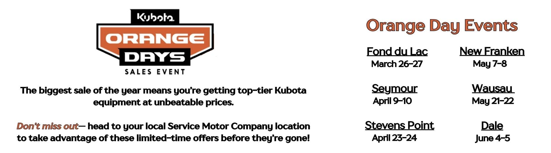 Service Motor Company is an authorized dealership for Case IH®, Kubota®, and Case CE, proudly serving the areas of Dale, Fond du Lac, New Franken, Seymour, Stevens Point, and Wausau in Wisconsin. We offer an extensive inventory of both new and used farm, construction, and lawn care equipment. When you decide to invest in a new tractor or used machinery, our friendly and knowledgeable teams in sales, financing, rentals, service, and parts are here to ensure that your experience is exceptional—from helping you choose the right equipment to providing ongoing maintenance and customization. Our goal is to build lasting relationships with our customers by delivering the best customer service possible.