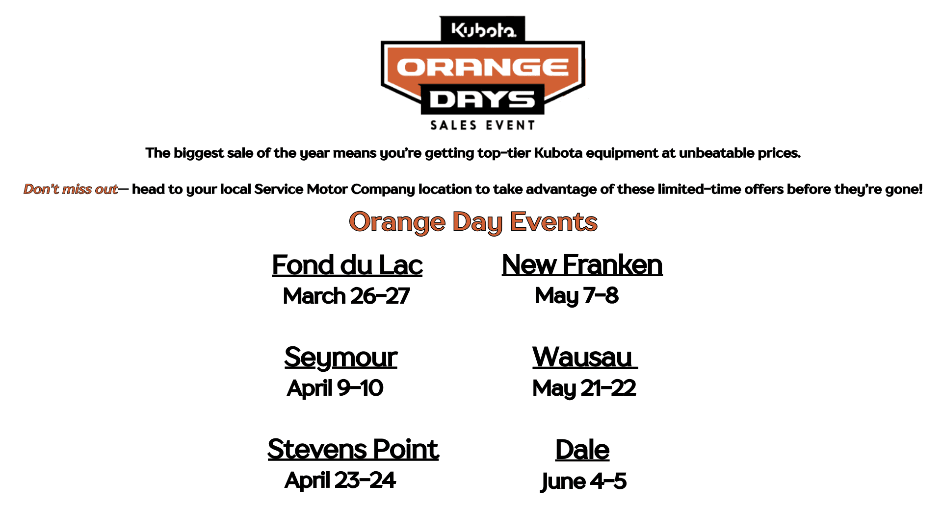 Service Motor Company is an authorized dealership for Case IH®, Kubota®, and Case CE, proudly serving the areas of Dale, Fond du Lac, New Franken, Seymour, Stevens Point, and Wausau in Wisconsin. We offer an extensive inventory of both new and used farm, construction, and lawn care equipment. When you decide to invest in a new tractor or used machinery, our friendly and knowledgeable teams in sales, financing, rentals, service, and parts are here to ensure that your experience is exceptional—from helping you choose the right equipment to providing ongoing maintenance and customization. Our goal is to build lasting relationships with our customers by delivering the best customer service possible.
