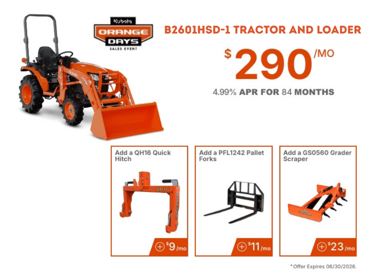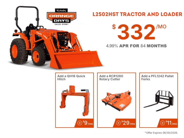 0% APR available or save up to $1,500 on your new Kubota TLB Series!