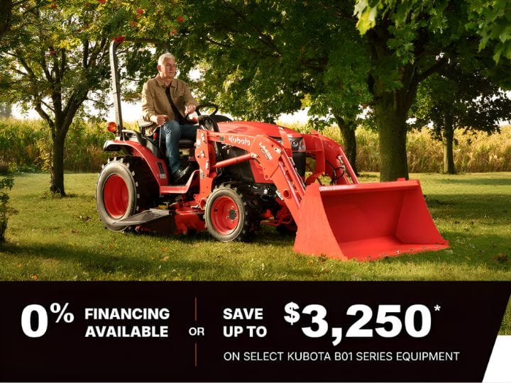 *Based on EDA/UCC Data from 01/01/2020 - 12/31/2024 for sales of new tractors 0-200 Hp in the USA.© Kubota Tractor Corporation, 2026. $0 Down, 0% A.P.R. financing for up to 36 months on purchases of new Kubota B2601 equipment dealers’ in-stock inventory is available to qualified purchasers through Kubota Credit Corporation, U.S.A.; subject to credit approval. Example: 36 monthly payments of $27.78 per $1,000 financed. Customer instant rebate of $3,250 on Kubota B2601 available with cash or standard rate financing, including $0 Down, 4.99% A.P.R. financing for up to 84 months. Customer Instant Rebate is not available with 0% A.P.R. or other promotional financing. Offers expire 02/28/26. Terms subject to change. For complete warranty, disclaimer, safety, incentive offer and product information, consult your Dealer or KubotaUSA.com.