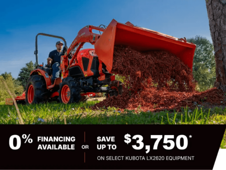 *Based on EDA/UCC Data from 01/01/2020 - 12/31/2024 for sales of new tractors 0-200 Hp in the USA.© Kubota Tractor Corporation, 2026. $0 Down, 0% A.P.R. financing for up to 36 months on purchases of new Kubota LX2620 ROPS equipment dealers’ in-stock inventory is available to qualified purchasers through Kubota Credit Corporation, U.S.A.; subject to credit approval. Example: 36 monthly payments of $27.78 per $1,000 financed. Customer instant rebate of $3,750 on Kubota LX2620 ROPS available with cash or standard rate financing, including $0 Down, 4.99% A.P.R. financing for up to 84 months. Customer Instant Rebate is not available with 0% A.P.R. or other promotional financing. Offers expire 02/28/26. Terms subject to change. For complete warranty, disclaimer, safety, incentive offer and product information, consult your Dealer or KubotaUSA.com.